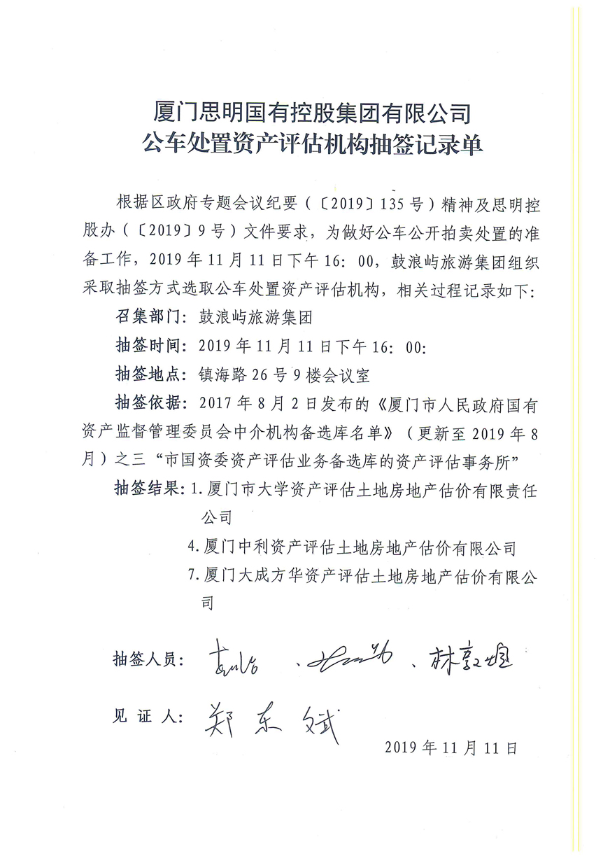 附件:1.《思明控股公車處置(第四批)資產(chǎn)評估機構抽簽記錄單》;