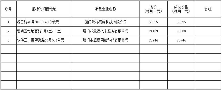 根據(jù)思明區(qū)國(guó)有企業(yè)資產(chǎn)出租管理的相關(guān)制度,我司2020年4月9日上午9:00起于觀音山營(yíng)運(yùn)中心2號(hào)樓2層2號(hào)會(huì)議室進(jìn)行公開招租現(xiàn)場(chǎng)開標(biāo),現(xiàn)通過思明控股網(wǎng)站對(duì)外發(fā)布成交公告,內(nèi)容如下: