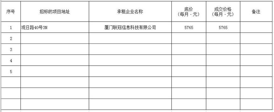 根據(jù)思明區(qū)國有企業(yè)資產(chǎn)出租管理的相關(guān)制度,我司2020年5月8日上午9:00起于觀音山營運(yùn)中心2號(hào)樓2層2號(hào)會(huì)議室進(jìn)行公開招租現(xiàn)場(chǎng)開標(biāo),現(xiàn)通過思明控股網(wǎng)站對(duì)外發(fā)布成交公告,內(nèi)容如下: