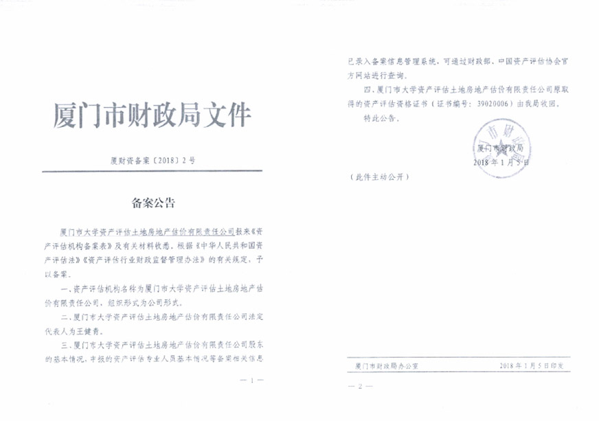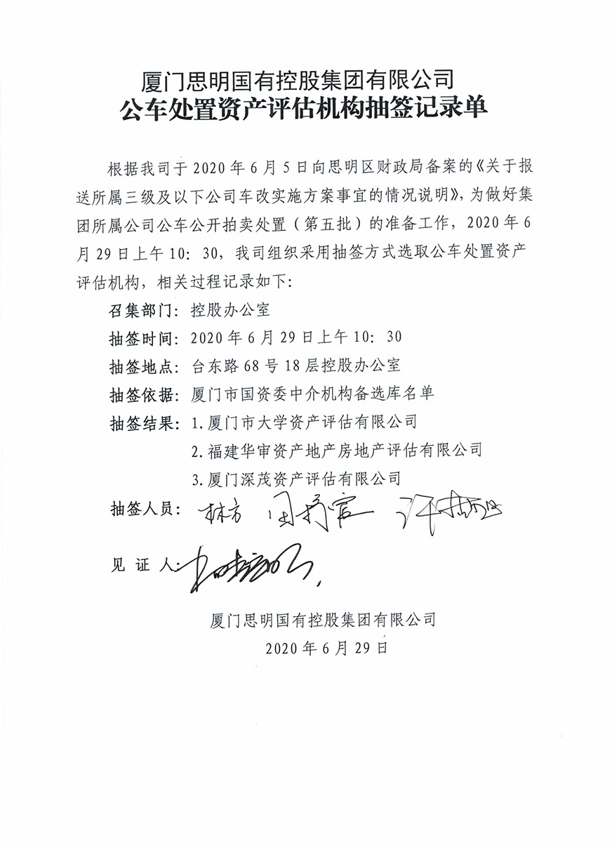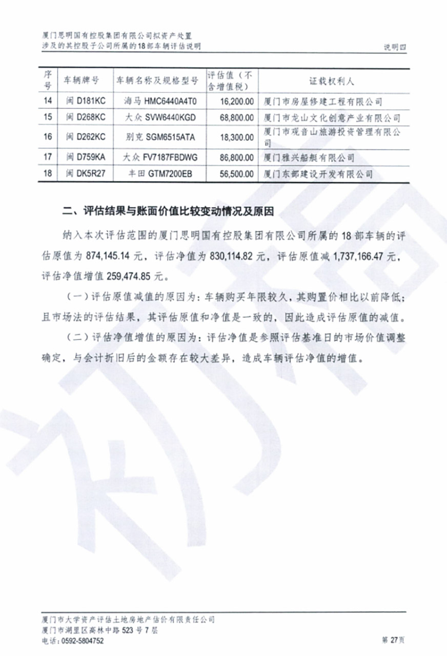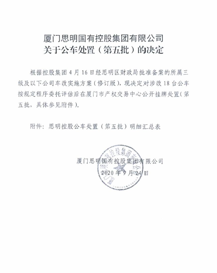 根據(jù)2020年6月5日我司報(bào)經(jīng)思明區(qū)財(cái)政局批準(zhǔn)備案的《關(guān)于報(bào)送所屬三級(jí)及以下公司車改實(shí)施方案事宜的情況說(shuō)明》相關(guān)文件精神,我司委托廈門市大學(xué)資產(chǎn)評(píng)估土地房地產(chǎn)估價(jià)有限責(zé)任公司對(duì)公車處置(第五批)的車輛進(jìn)行評(píng)估,該公司已于9月30日向我司提交資產(chǎn)評(píng)估結(jié)果初稿?,F(xiàn)將評(píng)估結(jié)果進(jìn)行公示,如有異議,歡迎來(lái)電來(lái)函反映。