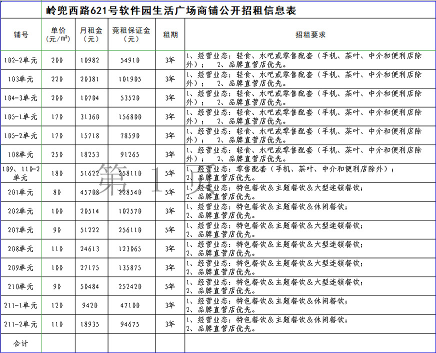 6、競租保證金:詳見附表(軟件園生活廣場公開招租信息表)。