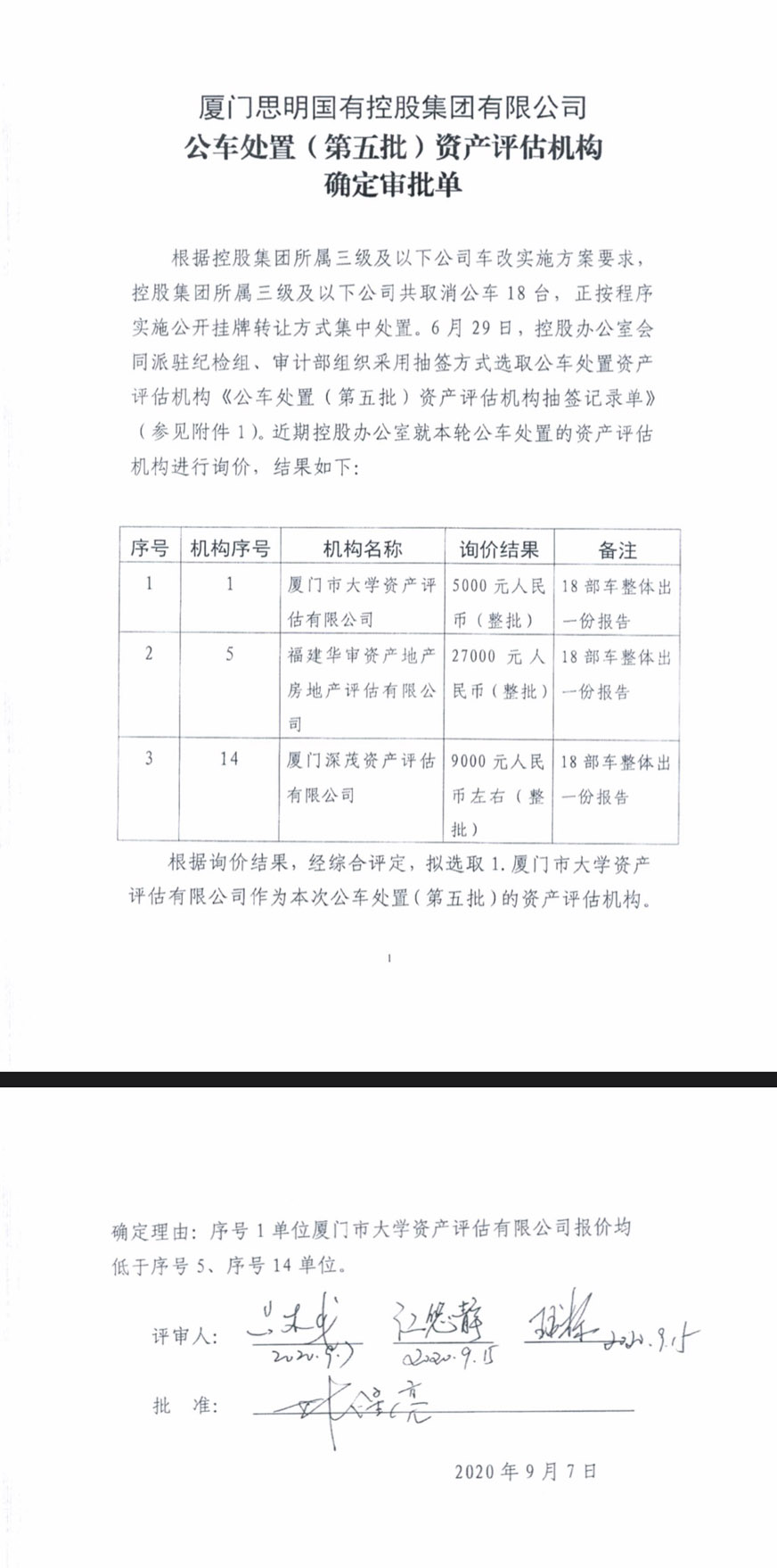 附件:1.《公車處置(第五批)資產(chǎn)評估機(jī)構(gòu)確定審批單》