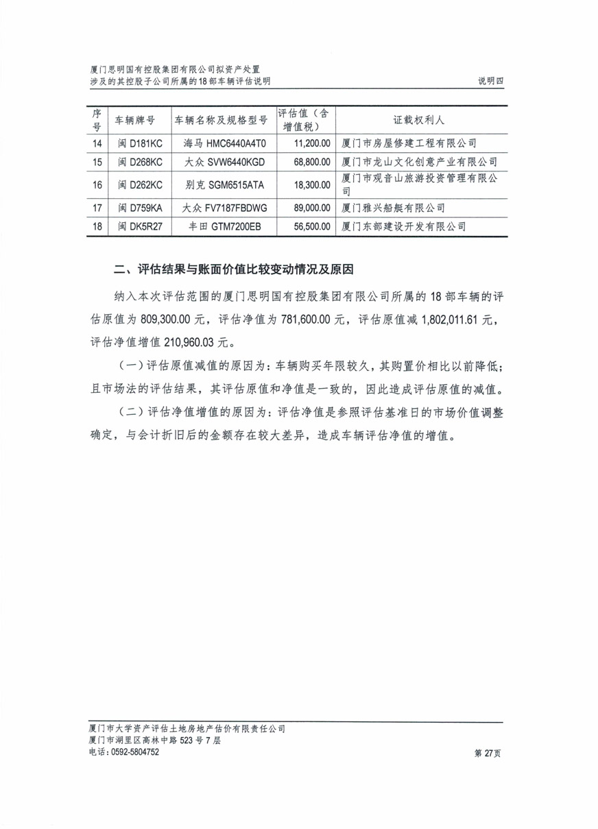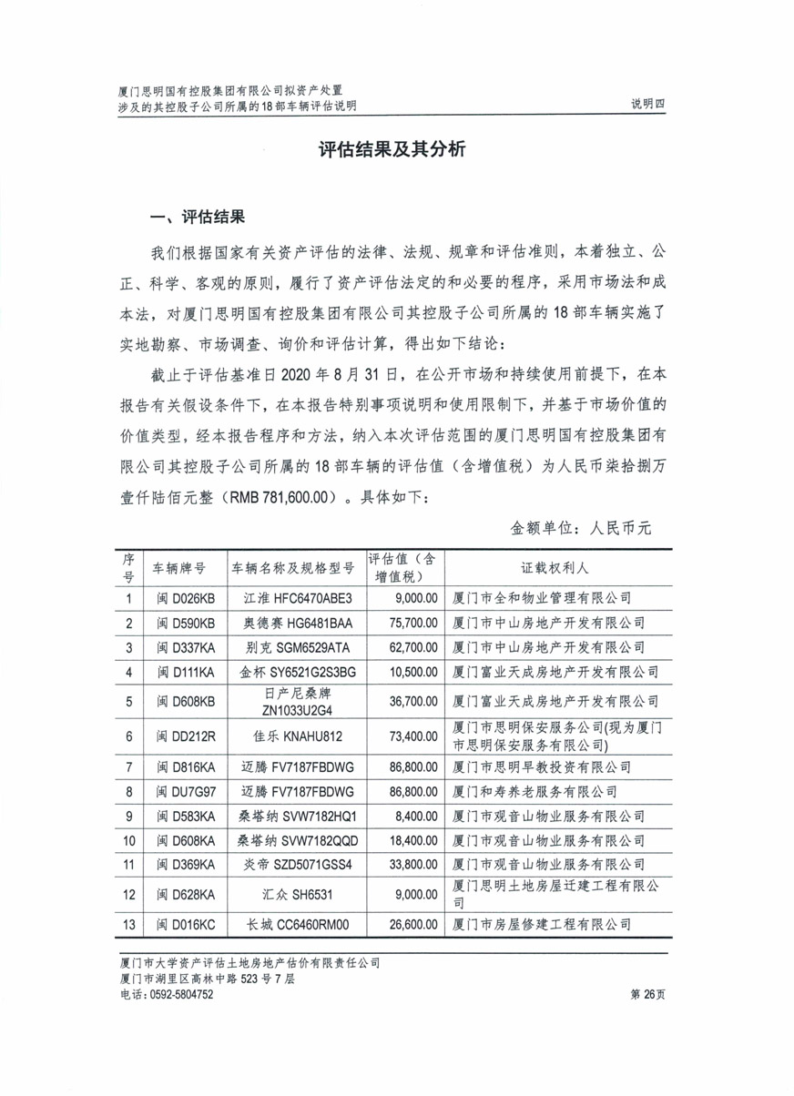 根據(jù)2020年6月5日我司報經(jīng)思明區(qū)財政局批準(zhǔn)備案的《關(guān)于報送所屬三級及以下公司車改實施方案事宜的情況說明》相關(guān)文件精神,我司委托廈門市大學(xué)資產(chǎn)評估土地房地產(chǎn)估價有限責(zé)任公司對公車處置(第五批)的車輛進(jìn)行評估,該公司已于11月10日向我司提交資產(chǎn)評估結(jié)果?,F(xiàn)將評估結(jié)果進(jìn)行公示,如有異議,歡迎來電來函反映。