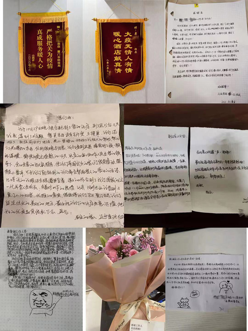 在這400多個日日夜夜中,我們思明區(qū)的隔離酒店專班共接收7萬多名入境旅客。在接收過程中分流到酒店的入境人員大多數(shù)對廈門及各地的防疫政策的不了解、不理解及需要引導(dǎo)等,入境旅客中有情緒激動的老人、有懷孕37周多的待產(chǎn)婦、也有生活無法自理的殘疾人、精神病患者、更有遇到困難尋求幫助的旅客,需要我們酒店專班工作人員耐心細(xì)致解釋廈門市及各地的防疫政策、及時疏導(dǎo)隔離人員焦慮的情緒,并引導(dǎo)隔離人員用良好的心態(tài)度過酒店留觀隔離期,體現(xiàn)全心全意為境外人員服務(wù)的高尚情懷。通過我們專班人文關(guān)懷、解難幫困,做到每個留觀人員最終理解這是為了全國人民的健康和為國家的安全應(yīng)盡的義務(wù),都積極主動配合,積極在公眾平臺上傳導(dǎo)正能量,隔離期間常有關(guān)心、慰問工作人員、隔離結(jié)束后常有留下字條、定制錦旗等溫暖舉動,通過寫感謝信、送鮮花、錦旗等方式表達(dá)感謝,專班工作得到旅客的認(rèn)可,在工作上的委屈、苦累和汗水瞬間化為烏有。
