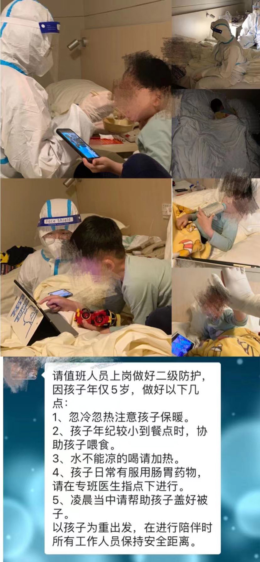今年4月份,一名年僅5歲的小朋友獨(dú)自搭乘飛機(jī)到廈門中轉(zhuǎn),分流到隔離酒店接受隔離觀察,在沒有辦法獨(dú)自生活自理的情況下,防疫工作人員充當(dāng)起“臨時保姆”,在保證工作人員安全的前提下照顧、陪伴小朋友。