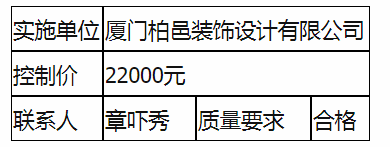 根據(jù)相關(guān)規(guī)定,我司負(fù)責(zé)裝修的園區(qū)服務(wù)大廳、觀音山驛站裝修設(shè)計(jì)項(xiàng)目直接發(fā)包廈門柏邑裝飾設(shè)計(jì)有限公司實(shí)施,現(xiàn)通過(guò)思明控股網(wǎng)站于2021年12月22日至2021年12月26日對(duì)外發(fā)布結(jié)果公告,內(nèi)容如下: