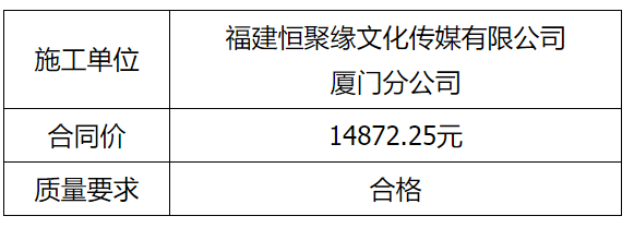 根據(jù)招投標管理辦法、思明控股辦[2021]14號文《采購招標管理辦法》的相關(guān)規(guī)定,我司負責(zé)龍山文創(chuàng)園標識牌制作及工業(yè)設(shè)計中心大門左側(cè)空調(diào)外機圍擋工程直接發(fā)包福建恒聚緣文化傳媒有限公司廈門分公司實施,現(xiàn)通過思明控股網(wǎng)站于2021年12月27日至2021年12月30日進行成交結(jié)果公示,內(nèi)容如下: