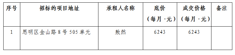根據(jù)思明區(qū)國有企業(yè)資產出租管理的相關制度,我司2021年11月28日上午10:00起于廈門市思明區(qū)嶺兜西路623號3樓商管公司會議室進行公開招標現(xiàn)場開標,現(xiàn)通過思明控股網站對外發(fā)布成交公告,內容如下: