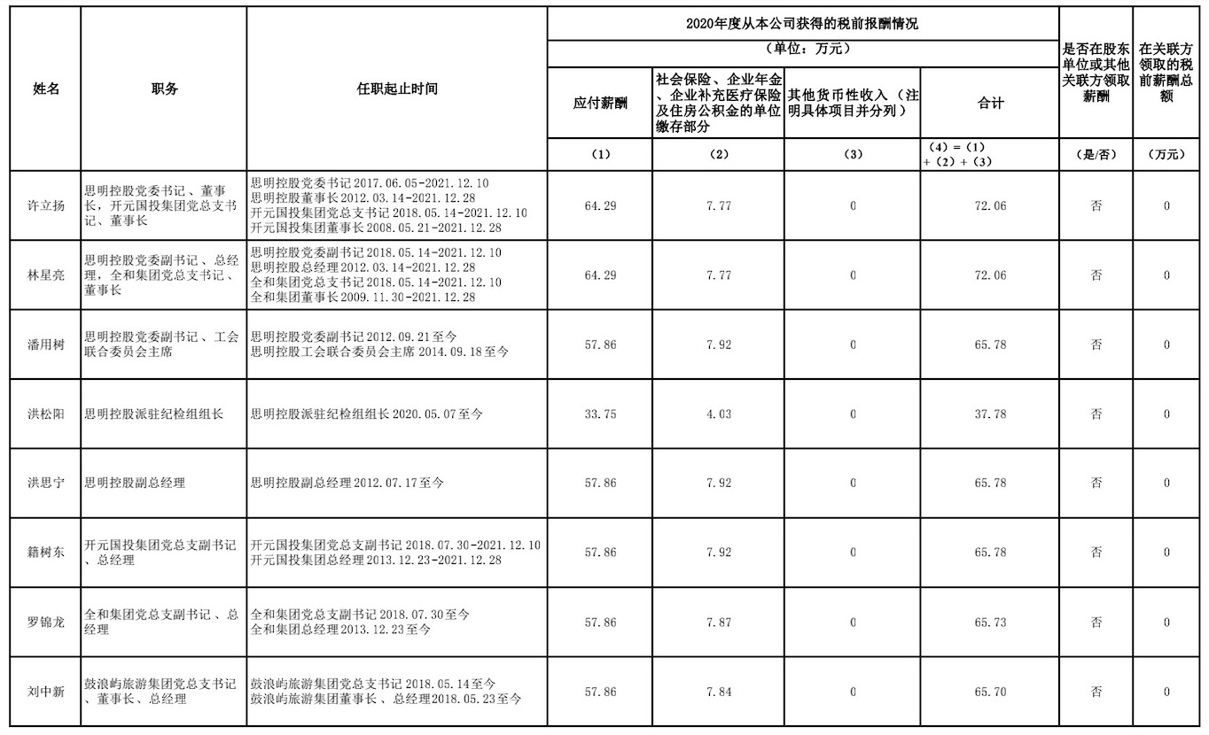 1.上表披露薪酬為廈門思明國有控股集團有限公司及三家二級公司企業(yè)負(fù)責(zé)人2020年度全部應(yīng)發(fā)稅前薪酬,不含三年任期激勵。