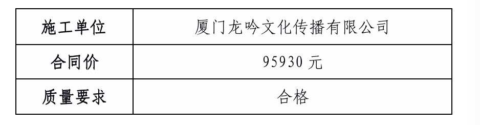 根據(jù)招投標(biāo)管理辦法、思明控股辦[2021]14號(hào)文《采購(gòu)招標(biāo)管理辦法》的相關(guān)規(guī)定,我司負(fù)責(zé)《思明影視拍攝服務(wù)指南》宣傳冊(cè)的照片拍攝、宣傳冊(cè)的設(shè)計(jì)制作項(xiàng)目直接發(fā)包廈門(mén)龍吟文化傳播有限公司拍攝和制作,現(xiàn)通過(guò)思明控股網(wǎng)站于2022年1月30日至2022年2月08日進(jìn)行成交結(jié)果公告,內(nèi)容如下: