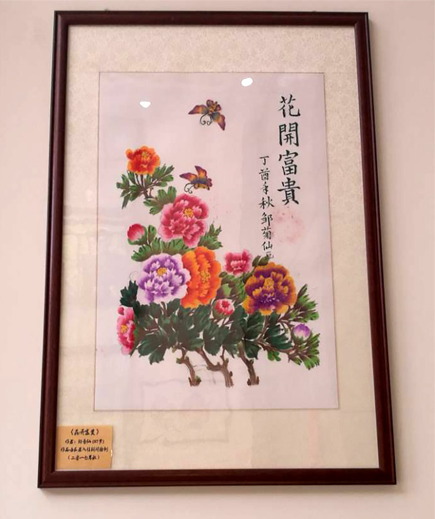 一幅幅栩栩如生的美麗書畫作品,展現(xiàn)在1樓大廳顯眼的位置,給整個公寓增添了幾分生氣。走進一看,有鄒菊仙奶奶的芬芳引蝶花開富貴牡丹,有98歲陳周光爺爺?shù)脑佀梢约懊坊ㄏ阕钥?/span>寒來作品,有80歲楊婉瑩奶奶的書法作品九成宮醴泉銘,還有汪建榮爺爺?shù)臅ㄉ鐣髁x價值觀.....這幾位爺爺奶奶看到自己的書畫作品展示在公寓展示欄里,甚是欣喜和滿足,他們也成為了我們源泉山莊老年公寓的小有名氣的書畫家。