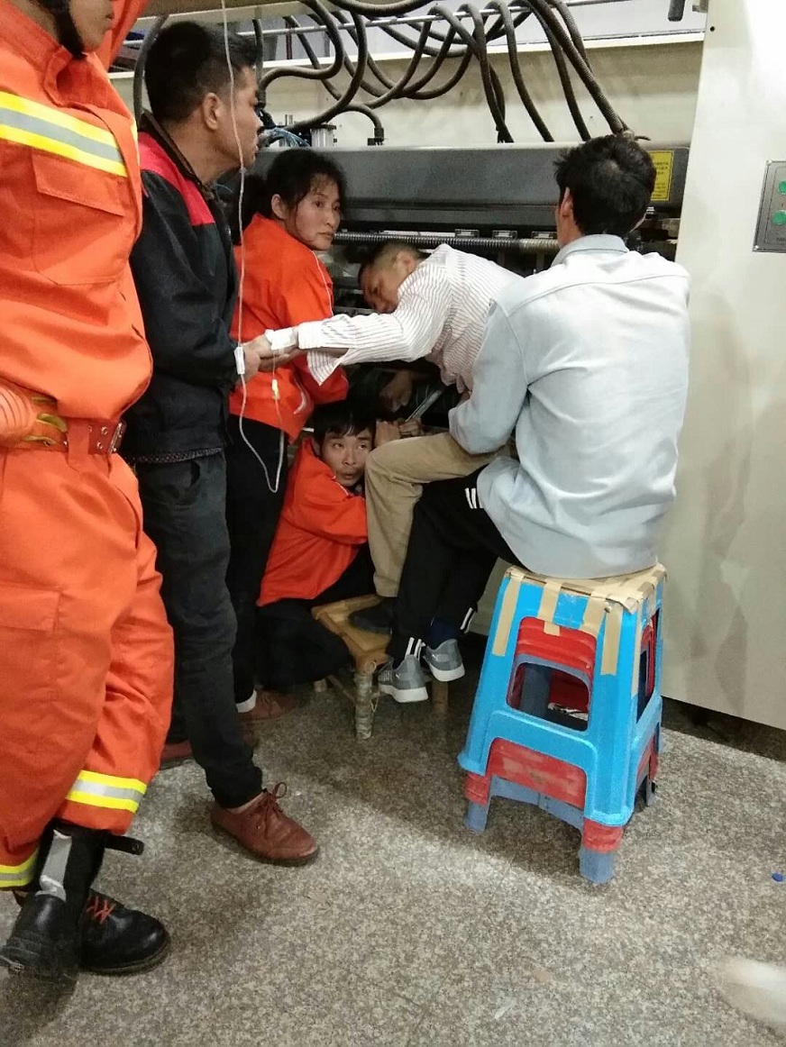 一個普通工人的手臂牽動著業(yè)主、物業(yè)管理人、消防官兵、120救援中心的心。因為機臺大,切割產生的高溫和火花易對傷者造成二次傷害,救援難度極大。救援小組迅速調整方案,用液壓擴張器將轉軸與機壁頂開,經過半個多小時的不懈努力,傷者成功脫險,最終保住了手臂。